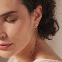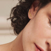 • Petites boucles d'oreille puces climbers asymétriques dont le motif est inspiré par le calice de l'Euphorbe, une plante généreuse et résistante du littoral charentais. En laiton doré à l'or fin. Un modèle original par son asymétrie et facile à porter avec sa légèreté et son motif finement gravé.