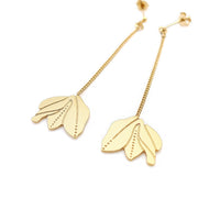 • Boucles d'oreille chaines pendantes dorées à l'or fin. Une fleur de magnolia finement gravée de nervures et de pointillés se balance au bout de la chaine fine.