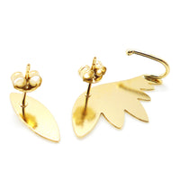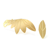 Boucles d'oreille asymétriques dorées à l'or fin: le climber s’attache sur le lobe droit comme une puce d’oreille et une patte permet de pincer l’oreille pour que le climber épouse parfaitement le lobe et ne bouge pas. La petite feuille se porte à gauche à la verticale ou à l'horizontale. Les boucles d'oreille ont un design unique, original et sobre à la fois.