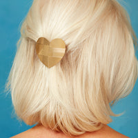 • Grande barrette Coeur finement gravée et dorée à l'or fin. Les stries rythment la surface dorée et accrochent la lumière avec des effets facettés. Le large clip permet d'attacher toute la chevelure ou une large mèche de cheveux épais. Elle sera parfaite pour briller pour des occasions uniques.