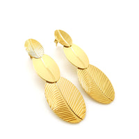 COLLECTION PALM - Maxi boucles d'oreille dorées à l'or fin, composées de 3 feuilles de palme superposées. Atypiques, contemporaines, originales, ces grandes boucles de caractère affirmeront votre personnalité tout en restant faciles à porter, ni trop grandes ni trop petites.