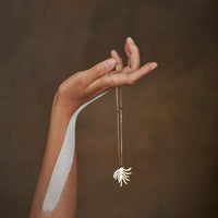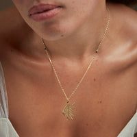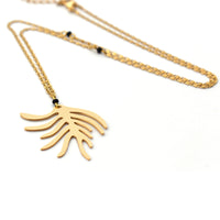 • Sautoir composé d'une chaine fine plate et de petites perles noires mates et d'une pampille au motif de gorgone (corail de l'Atlantique). En laiton doré à l'or fin.