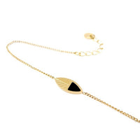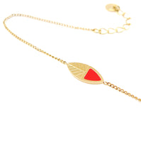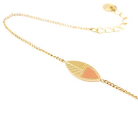 COLLECTION KANUMÉRA - Petit bracelet doré à l'or fin agrémenté d'une feuille finement gravée et émaillée à la main. Joyeux et estival avec sa petite touche colorée, il peut se porter en accumulation avec d'autres petits bracelets. Il est réglable avec sa petite chainette qui permet de l'ajuster à votre tour de poignet.