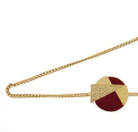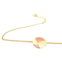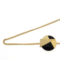 • Bracelet doré à l'or fin très graphique dont le médaillon émaillé est constitué d'un rond, une ligne et un triangle finement gravés. Son design minimaliste en fait un bracelet intemporel, chic et ultra féminin. Il est réglable avec sa petite chainette qui permet de l'ajuster à votre tour de poignet.