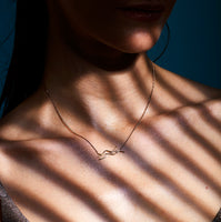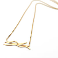 • Collier doré à l'or fin dont le motif joue avec 2 éléments graphiques: le trait droit représente l’horizon et la courbe: l’océan, les vagues. Graphique, pur, intemporel, il peut se porter tous les jours grâce à sa sobriété et sa légèreté